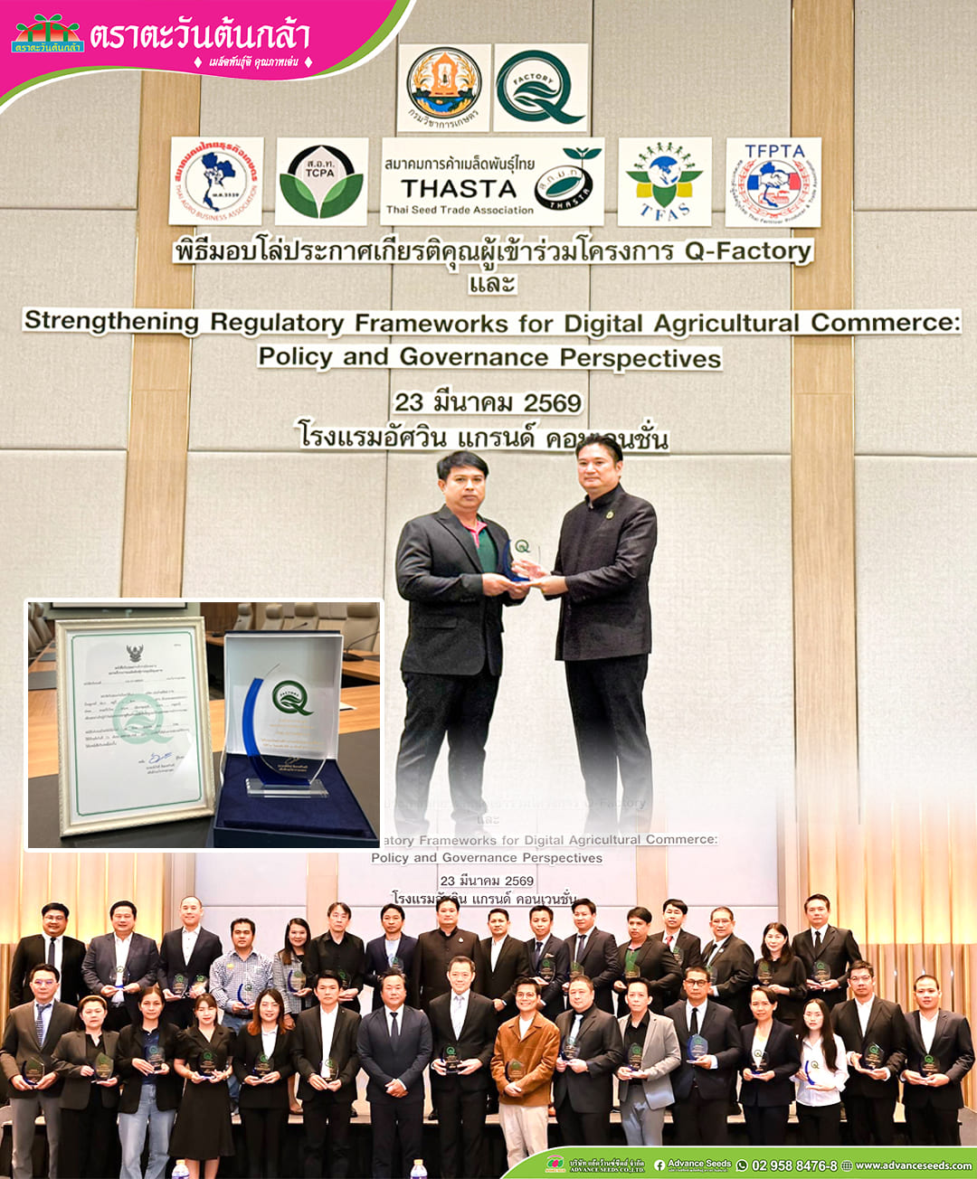 บริษัท แอ๊ดว้านซ์ซีดส์ จำกัด ได้รับมอบป้ายและเกียรติบัตรรับรองมาตรฐาน "Q Factory" จากกรมวิชาการเกษตร กระทรวงเกษตรและสหกรณ์