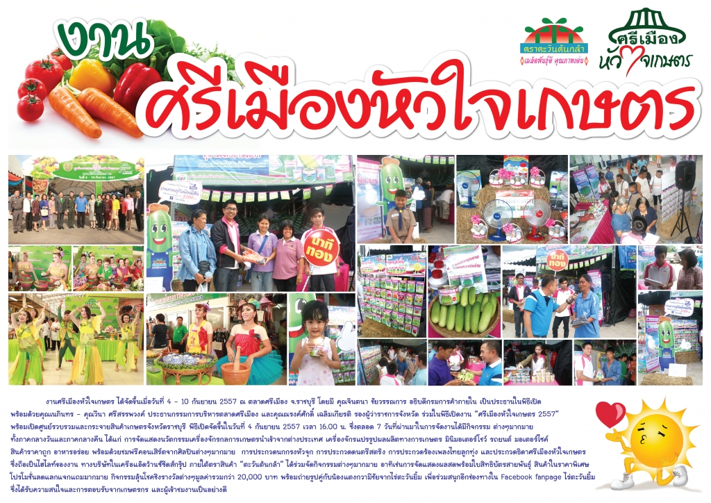 งานศรีเมืองหัวใจเกษตร ได้จัดขึ้นเมื่อวันที่ 4 - 10 กันยายน 2557 ณ ตลาดศรีเมือง จ.ราชบุรี ทางบริษัทในเครือแอ๊ดว้านซ์ซีดส์กรุ๊ป ภายใต้ตราสินค้า “ตะวันต้นกล้า” ได้ร่วมจัดกิจกรรมต่างๆมากมาย อาทิเช่น การจัดแสดงผลสดพร้อมใบสิทธิ์บัตรสายพันธุ์ สินค้าในราคาพิเศษ โปรโมชั่นลดแลกแจกแถมมากมาย กิจกรรมลุ้นโชคชิงรางวัลต่างๆมูลค่ารวมกว่า 20,000 บาท พร้อมถ่ายรูปคู่กับน้องแตงกวามีชัยจากไร่ตะวันยิ้ม เพื่อร่วมสนุกอีกช่องทางใน Facebook fanpage ไร่ตะวันยิ้ม ซึ่งได้รับความสนใจและการตอบรับจากเกษตรกร และผู้เข้าชมงานเป็นอย่างดี