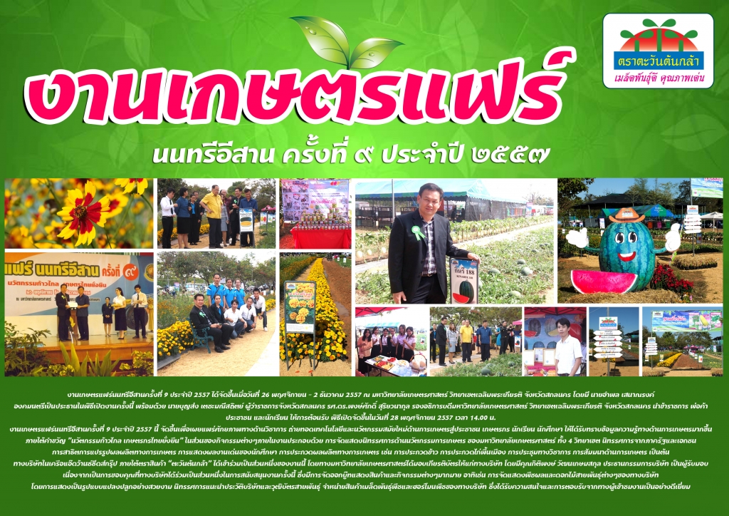 งานเกษตรแฟร์นนทรีอีสานครั้งที่ 9 ประจำปี 2557 ได้จัดขึ้นเมื่อวันที่ 26 พฤศจิกายน - 2 ธันวาคม 2557 ณ มหาวิทยาลัยเกษตรศาสตร์ วิทยาเขตเฉลิมพระเกียรติ จังหวัดสกลนครทางบริษัทในเครือแอ๊ดว้านซ์ซีดส์กรุ๊ป ภายใต้ตราสินค้า “ตะวันต้นกล้า” ได้เข้าร่วมเป็นส่วนหนึ่งของงานนี้ โดยทางมหาวิทยาลัยเกษตรศาสตร์ได้มอบเกียรติบัตรให้แก่ทางบริษัท โดยมีคุณกิติพงษ์ วัฒนเกษมสกุล ประธานกรรมการบริษัท เป็นผู้รับมอบเนื่องจากเป็นการขอบคุณที่ทางบริษัทได้ร่วมเป็นส่วนหนึ่งในการสนับสนุนงานครั้งนี้ ซึ่งมีการจัดออกบู๊ทแสดงสินค้าและกิจกรรมต่างๆมากมาย ซึ่งได้รับความสนใจและการตอบรับจากทางผู้เข้าชมงานเป็นอย่างดีเยี่ยม