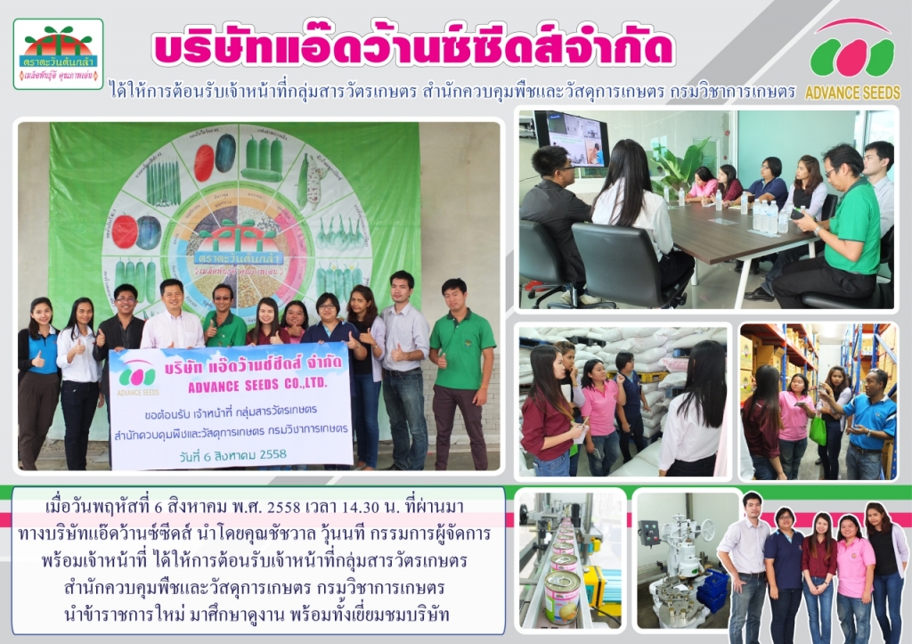 เมื่อวันพฤหัสที่ 6 สิงหาคม พ.ศ. 2558 เวลา 14.30 น. ที่ผ่านมา ทางบริษัทแอ๊ดว้านซ์ซีดส์ นำโดยคุณชัชวาล วุ้นนที กรรมการผู้จัดการ พร้อมเจ้าหน้าที่ ได้ให้การต้อนรับเจ้าหน้าที่กลุ่มสารวัตรเกษตร สำนักควบคุมพืชและวัสดุการเกษตร กรมวิชาการเกษตร เพื่อนำข้าราชการใหม่ มาศึกษาดูงาน พร้อมทั้งเยี่ยมชมบริษัท โดยมีการพูดคุยเกี่ยวกับข้อมูลต่างๆของบริษัท อาทิเช่น ประวัติความเป็นมาของบริษัท แจกแจงถึงลำดับขั้นตอนการผลิตเมล็ดพันธุ์พืช และยังมีการเดินเยี่ยมชมในส่วนงานแต่ละแผนก