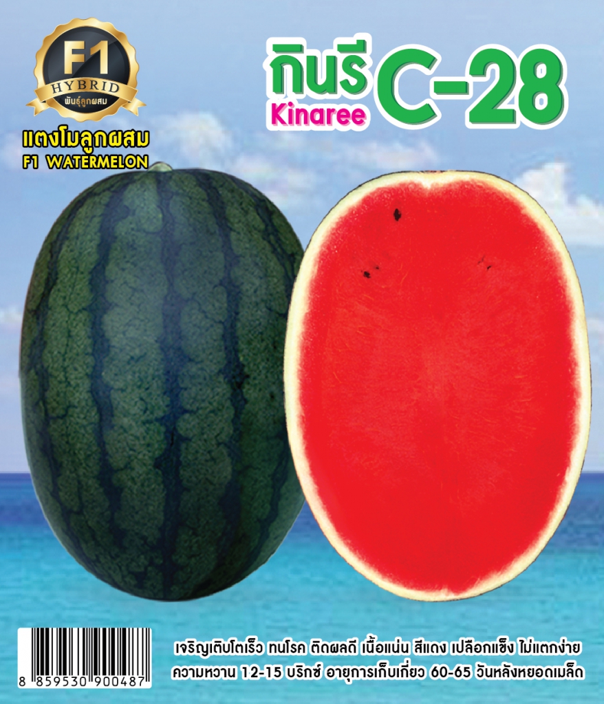 แตงโมลูกผสม ผลโตทรงกลมรี เนื้อแน่นละเอียด แดงจัด หวานกรอบ ไส้ไม่แตก เปลือกบางแต่แข็ง ทนทานต่อการขนส่ง ขนาดผล 3-5 กก. ความหวาน 12-14 บริกซ์
