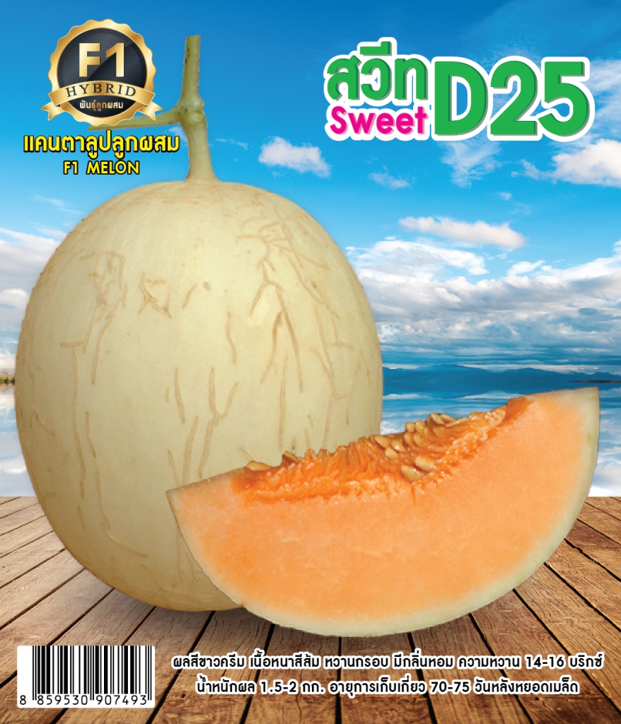ผลกลมรีสีขาวครีม ขั้วเหนียว ติดผลง่ายสม่ำเสมอ เนื้อหนาสีส้ม หวานกรอบ มีกลิ่นหอม ความหวาน 14-17 บริกซ์ น้ำหนัก 1.5-2.0 กก. ปลูกได้ตลอดปี สามารถเก็บผลผลิตได้นาน