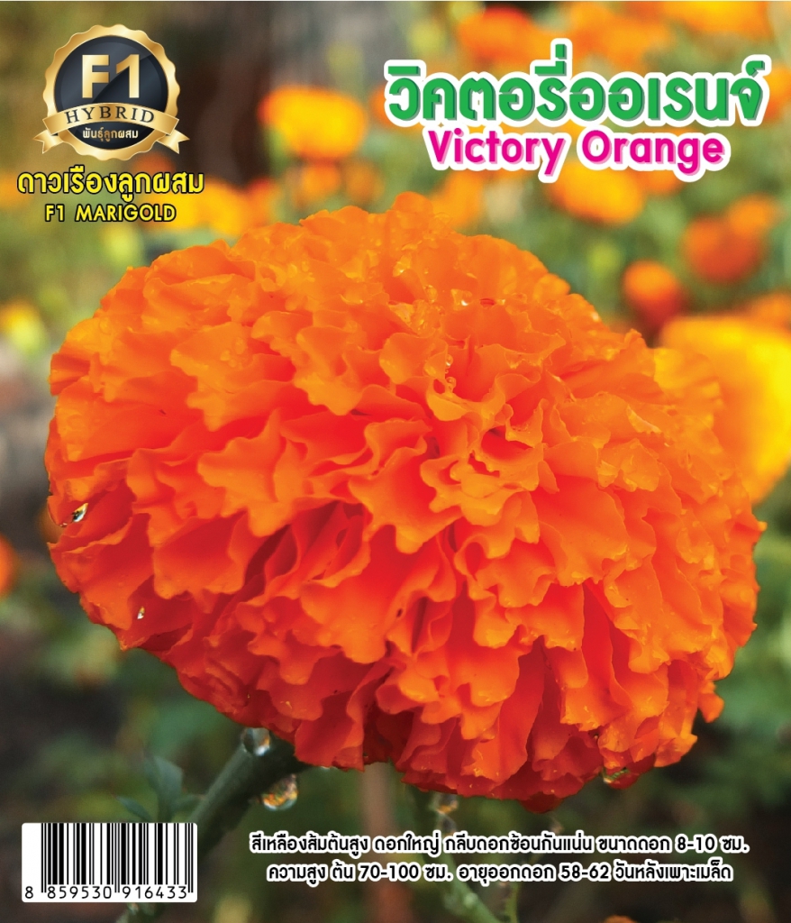 ดาวเรืองลูกผสมสีเหลืองส้มต้นสูง ดอกใหญ่ กลีบดอกซ้อนกันแน่น ขนาดดอก 8-10 ซม. ให้จำนวนดอกมาก ความสูงต้น 70-100 ซม. เหมาะสำหรับปลูกเป็นไม้กระถาง และตัดดอกจำหน่าย