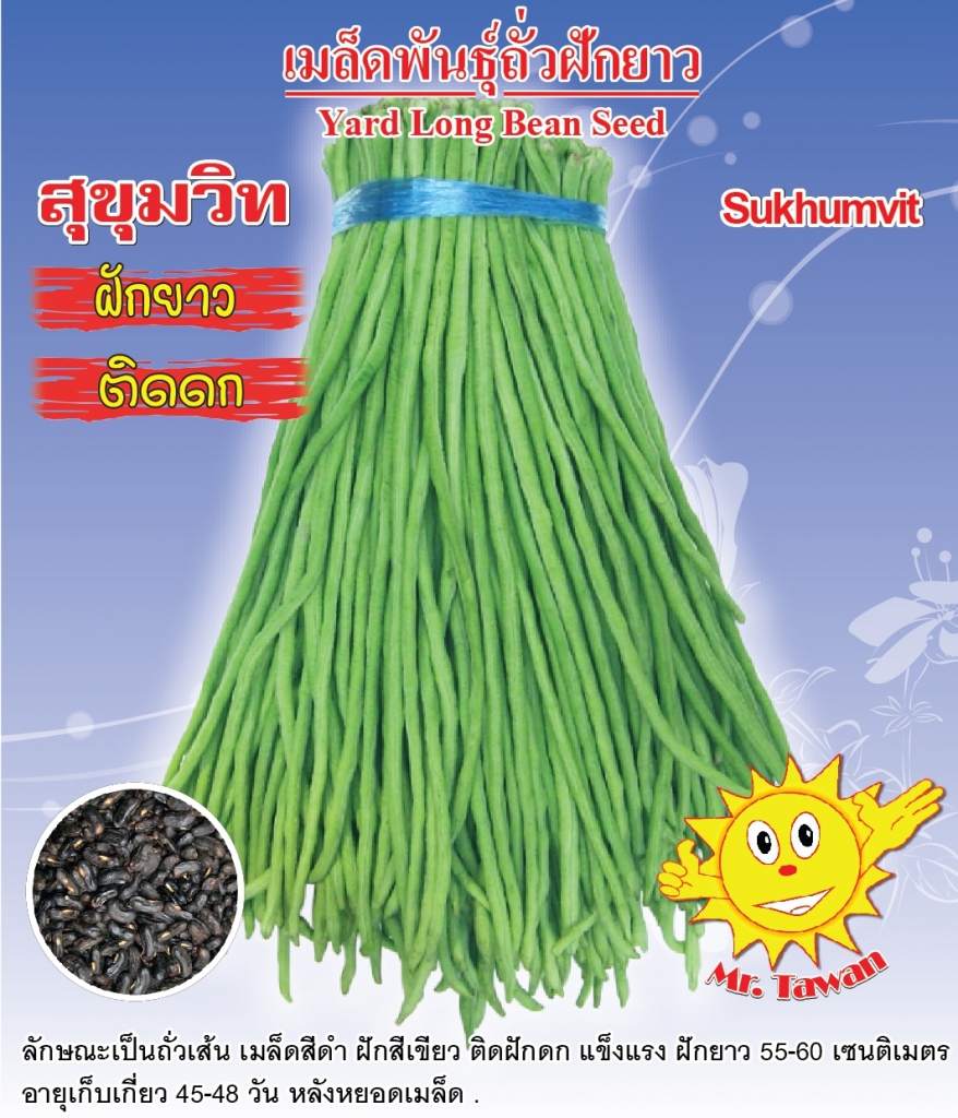 ถั่วเส้นเมล็ดสีดำ ฝักยาว สีเขียวสด ติดดกมาก แข็งแรง ต้านทานโรคได้ดี ฝักยาว 55-60 ซม.