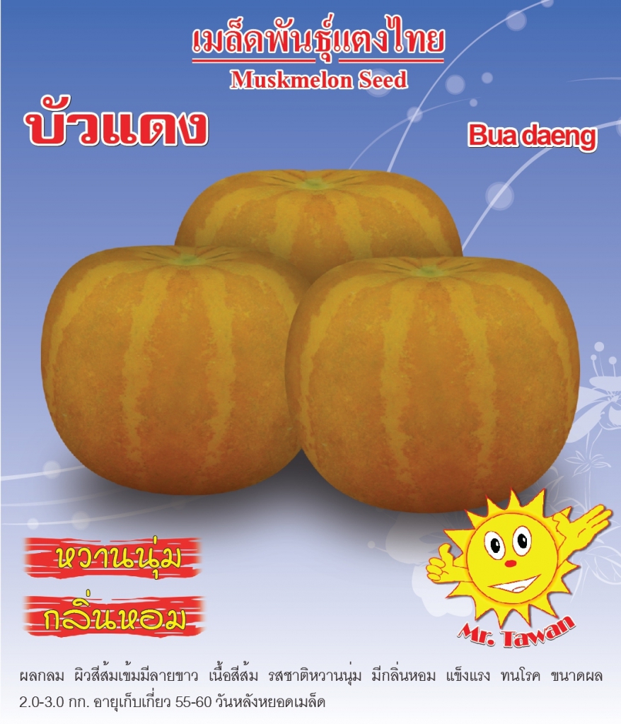 ผลกลม ผิวสีส้มเข้มมีลายขาว เนื้อส้ม รสชาติหวานนุ่ม มีกลิ่นหอม แข็งแรง ทนโรค ขนาดผล 2-3 กก.