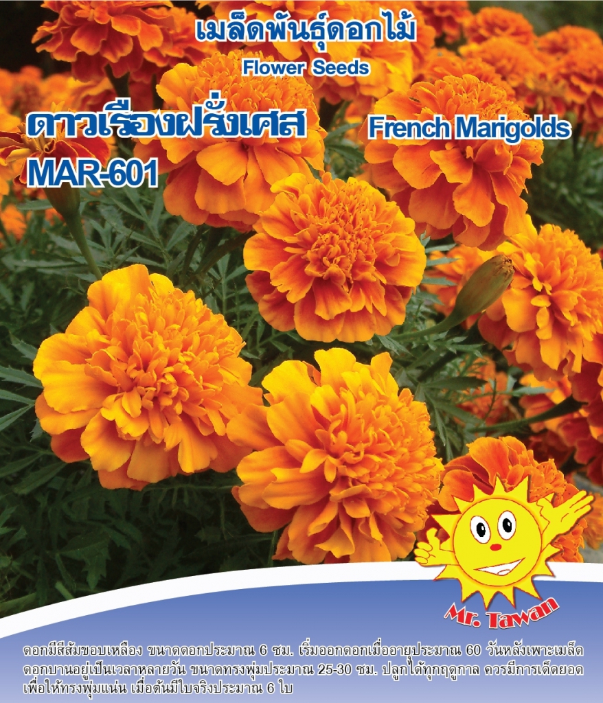 ดอกสีส้ม ขนาดดอก 6 ซม. เริ่มออกดอกเมื่ออายุประมาณ 60 วันหลังหยอดเมล็ด ดอกบานอยู่เป็นเวลาหลายวัน ขนาดทรงพุ่ม 25-30 ซม. ปลูกได้ทุกฤดู ควรมีการเด็ดยอด เพื่อให้ทรงพุ่มแน่น เมื่อต้นกล้ามีใบจริง 6 ใบ