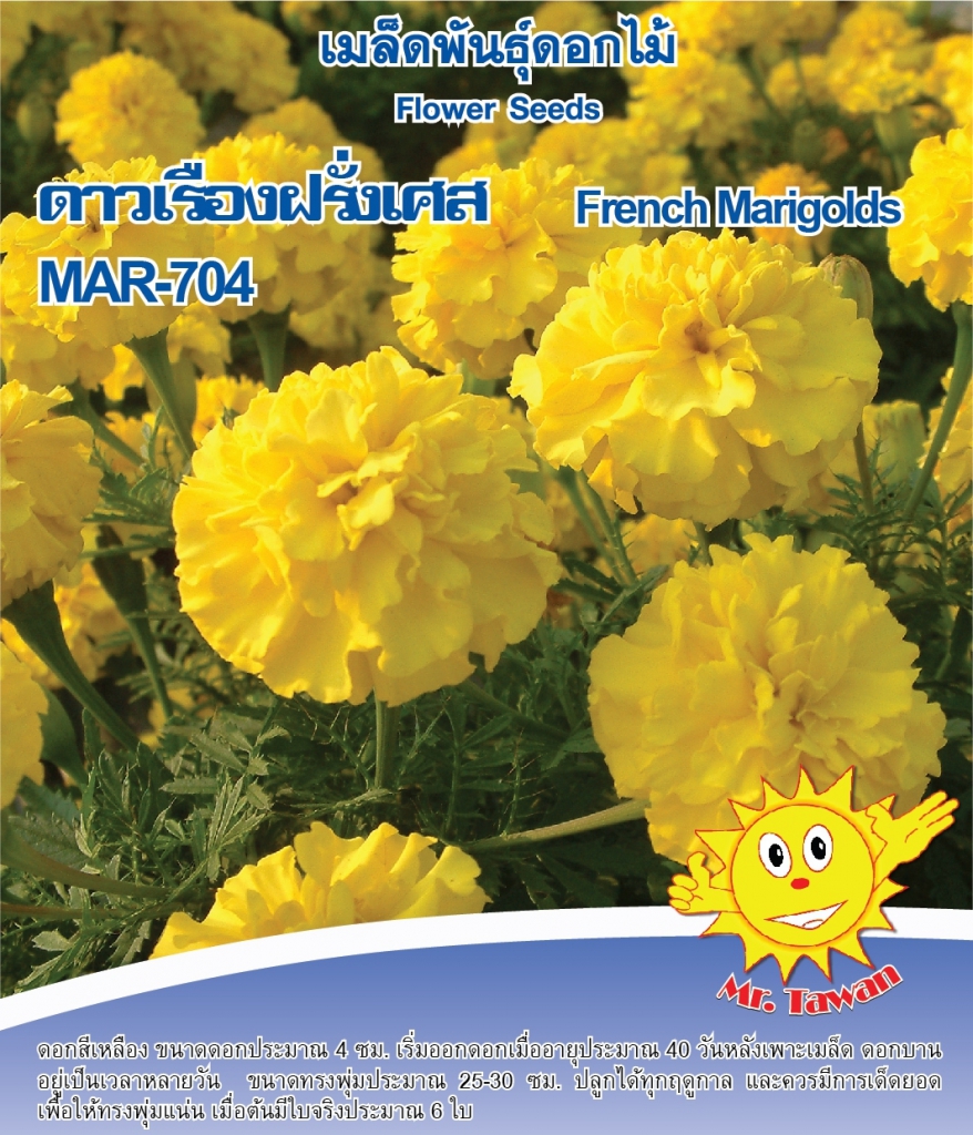 ดอกสีเหลือง ขนาดดอกประมาณ 6 ซม. เริ่มออกดอกเมื่ออายุประมาณ 60 วันหลังหยอดเมล็ด ดอกบานอยู่เป็นเวลาหลายวัน ขนาดทรงพุ่มประมาณ 25-30 ซม. ปลูกได้ทุกฤดูกาล และควรมีการเด็ดยอด เพื่อให้ทรงพุ่มแน่น เมื่อต้นมีใบจริง 6 ใบ