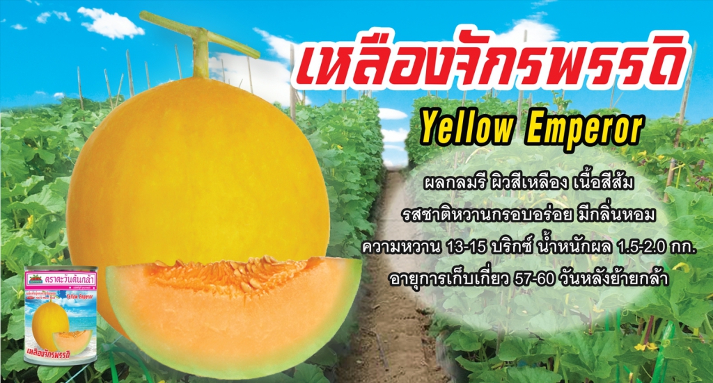 “Yellow Emperor” cantaloupe, one of the best seller product, easy to grow both greenhouse and open field production, golden yellow smooth skin, round shape, fruit weight 1.5-2.0 kg with high sugar content 13-15 brix, maturity of 57-60 days after transplanting.
