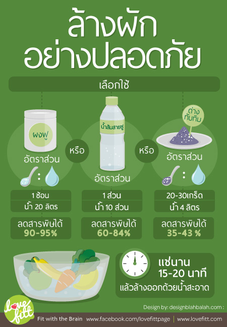 - น้ำเกลือ – ใช้เกลือป่น 1 ช้อนโต๊ะ ผสมน้ำ 4 ลิตร และล้างด้วยน้ำสะอาดอีกครั้งลดปริมาณสารพิษตกค้างได้ 29-38 %