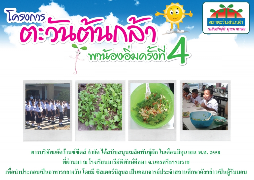 โครงการ “ตะวันต้นกล้า พาน้องอิ่มครั้งที่ 4” บริษัทแอ๊ดว้านซ์ซีดส์จำกัด ได้สนับสนุนเมล็ดพันธุ์ผักและดอกไม้ ในเดือนมิถุนายน พ.ศ. 2558 ที่ผ่านมา ณ โรงเรียนมารีย์พิทักษ์ศึกษา จ.นครศรีธรรมราช โดยประสานงานร่วมกับซิสเตอร์นิลุบล เป็นคณาจารย์ประจำสถานศึกษาดังกล่าว และได้แนะนำถึงวิธีการเพาะปลูกพร้อมคู่มือให้แด่โรงเรียนแห่งนี้อีกด้วย
