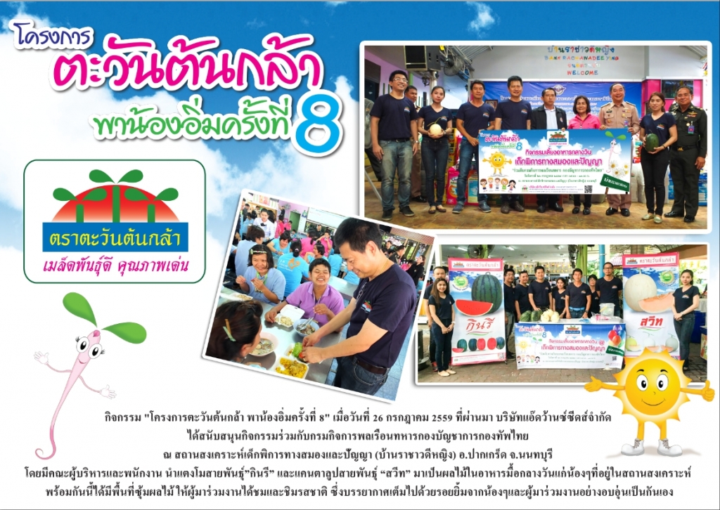 เมื่อวันที่ 26 กรกฎาคม 2559 ที่ผ่านมา บริษัทแอ๊ดว้านซ์ซีดส์จำกัด ได้สนับสนุนกิจกรรมร่วมกับกรมกิจการพลเรือนทหารกองบัญชาการกองทัพไทย ณ สถานสงเคราะห์เด็กพิการทางสมองและปัญญา (บ้านราชาวดีหญิง) อ.ปากเกร็ด จ.นนทบุรี โดยมีคณะผู้บริหารและพนักงาน นำแตงโมสายพันธุ์”กินรี” และแคนตาลูปสายพันธุ์ “สวีท” มาเป็นผลไม้ในอาหารมื้อกลางวันแก่น้องๆที่อยู่ในสถานสงเคราะห์ พร้อมกันนี้ได้มีพื้นที่ซุ้มผลไม้ ให้ผู้มาร่วมงานได้ชมและชิมรสชาติ ซึ่งบรรยากาศเต็มไปด้วยรอยยิ้มจากน้องๆและผู้มาร่วมงานอย่างอบอุ่นเป็นกันเอง