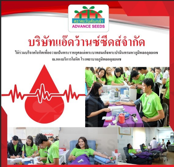 ในวันที่ 9 พฤศจิกายน 2560 ที่ผ่านมา บริษัทแอ๊ดว้านซ์ซีดส์จำกัด นำโดยผู้บริหารและพนักงานทุกภาคส่วนได้ร่วมบริจาคโลหิต เพื่่อถวายเป็นพระราชกุศลแด่พระบาทสมเด็จพระปรมินทรมหาภูมิพลอุดุลยเดช ณ กองบริการโลหิต โรงพยาบาลภูมิพลอดุลยเดช