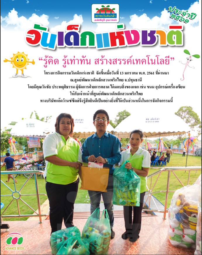 ณ ศูนย์พัฒนาเด็กเล็กสวนพริกไทย จ.ปทุมธานี โดยมีคุณวันชัย ประพฤติธรรม ผู้จัดการฝ่ายการตลาดได้มอบสิ่งของแจก เช่น ขนม อุปกรณ์เครื่องเขียน ให้กับเจ้าหน้าที่ศูนย์พัฒนาเด็กเล็กสวนพริกไทย ทางบริษัทแอ๊ดว้านซ์ซีดส์จึงรู้สึกยินดีเป็นอย่างยิ่งที่ได้เป็นส่วนหนึ่งในการจัดกิจกรรมนี้