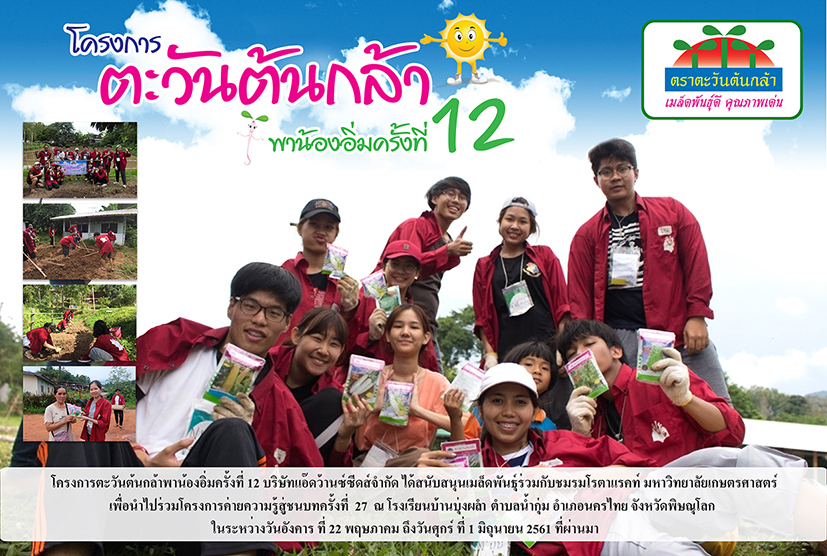 โครงการตะวันต้นกล้าพาน้องอิ่มครั้งที่ 12 บริษัทแอ๊ดว้านซ์ซีดส์จำกัด ได้สนับสนุนเมล็ดพันธุ์ร่วมกับชมรมโรตาแรคท์ มหาวิทยาลัยเกษตรศาสตร์ เพื่อนำไปร่วมโครงการค่ายความรู้สู่ชนบทครั้งที่ 27 ณ โรงเรียนบ้านบุ่งผลำ ตำบลน้ำกุ่ม อำเภอนครไทย จังหวัดพิษณุโลก ในระหว่างวันอังคาร ที่ 22 พฤษภาคม ถึงวันศุกร์ ที่ 1 มิถุนายน 2561 ที่ผ่านมา