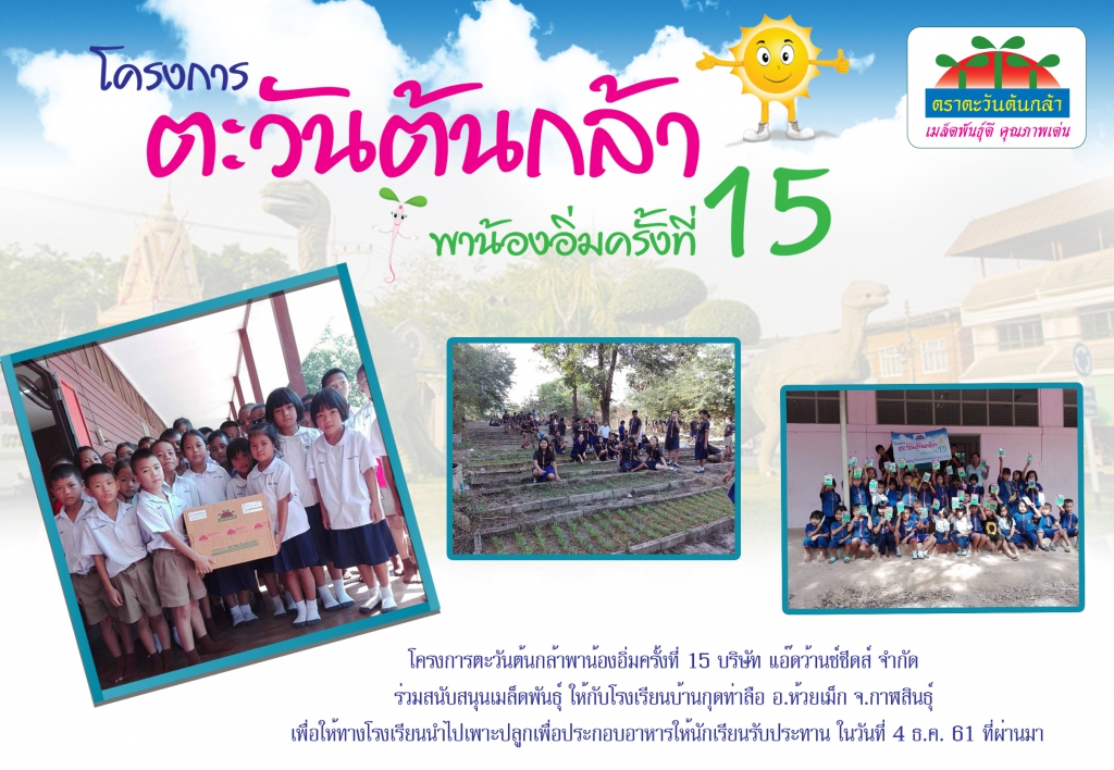 โครงการตะวันต้นกล้าพาน้องอิ่มครั้งที่ 15 บริษัท แอ๊ดว้านซ์ซีดส์ จำกัด ร่วมสนับสนุนเมล็ดพันธุ์ ให้กับโรงเรียนบ้านกุดท่าลือ อ.ห้วยเม็ก จ.กาฬสินธุ์ เพื่อให้ทางโรงเรียนนำไปเพาะปลูกเพื่อประกอบอาหารให้นักเรียนรับประทาน ในวันที่ 4 ธ.ค. 61 ที่ผ่านมา